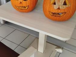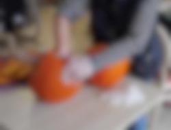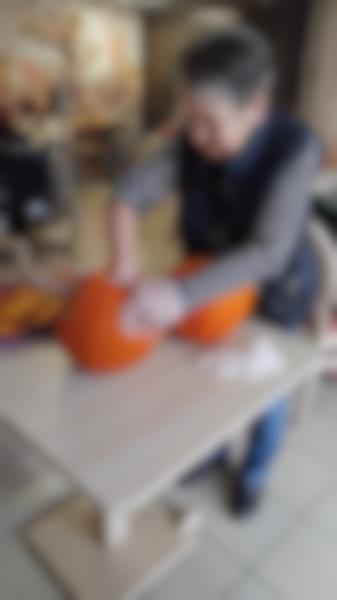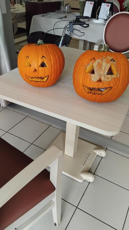 Cet après-midi, le personnel et une résidente ont participé à un petit atelier créatif pour découper et évider et deux citrouilles. Entre la difficulté à découper et les rires générés par l'activité, nous sommes plutôt satisfait du résultat et nous avons une jolie décoration qui vient embellir le hall.