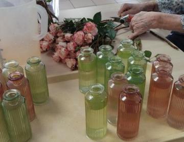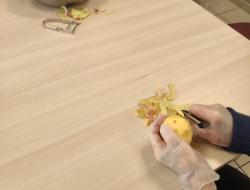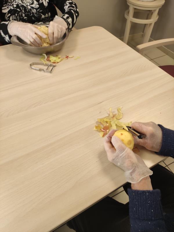 Nous commençons la matinée par répartir les tâches. Chaque résident a une tâche précise : certains vont éplucher les pommes, d'autres vont les couper en tranches fines, pendant que d'autres encore s'occupent de la pâte. Les gestes sont lents, mais chacun participe à sa manière, en prenant son temps, ce qui crée une ambiance détendue et chaleureuse.