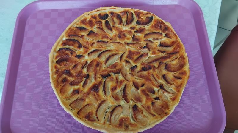 Le premier morceau est servi et, au moment de la dégustation, les sourires se dessinent sur les visages. La tarte est à la fois tendre et croquante, sucrée juste ce qu'il faut, et chaque bouchée ravive un sentiment de satisfaction. Les discussions continuent joyeusement, mais cette fois autour de la dégustation, de l’instant présent, en savourant pleinement cette création partagée.