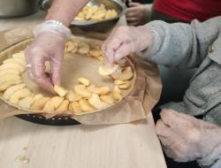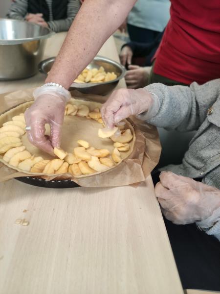 C’est un moment très créatif où l'odeur sucrée commence à envahir l’espace. En parallèle, nous discutons des souvenirs liés aux tartes aux pommes : certains se souviennent des tartes de leur enfance, préparées en famille, d'autres évoquent les astuces de grand-mère pour faire la pâte. Ces échanges ajoutent une touche de chaleur et d'intimité à l'activité.